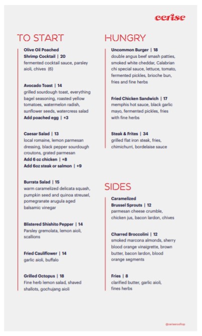 Welcome to Cerise Rooftop, where the skyline meets exceptional tastes in downtown Chicago. Located on the 26th floor at 203 N Wabash Ave, this stylish venue offers a vibrant menu of artisanal cocktails and a curated selection of wines. Sip on unique drinks like the Lavender Bees Knees or classic Margarita, each crafted with fresh ingredients and local flair.